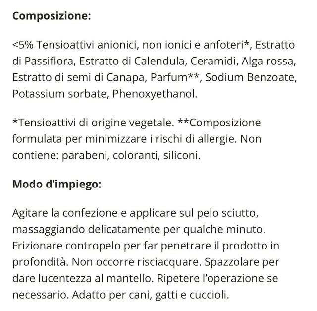 Arricchita con Estratto di Calendula ed Estratto di Passiflora ad azione lenitiva e con Ceramidi ad effetto idratante, aiuta a calmare la pelle, sostenere la barriera cutanea e migliorare il comfort della cute. Una soluzione pratica e sicura per l’igiene quotidiana e il benessere di cani e gatti.