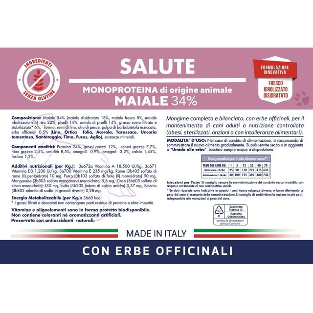 Vet Line Secco Monoproteico Cane Salute Maiale è il mangime secco completo e bilanciato, con carni fresche ed erbe officinali, per il mantenimento di cani adulti a nutrizione controllata (obesi, con intolerranze alimentari e non solo).