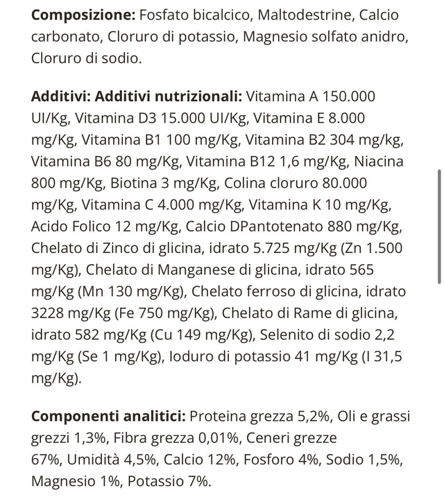 La formula apporta macroelementi minerali essenziali come calcio, fosforo, magnesio, sodio e potassio, insieme a oligoelementi per cani (zinco, ferro, rame, manganese, selenio e iodio), studiati per compensare le carenze tipiche delle diete fatte in casa.