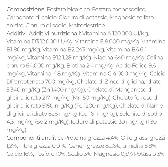 Fornisce minerali essenziali e oligoelementi spesso carenti nelle diete fatte in casa, supportando crescita, ossa forti e sviluppo armonioso.
